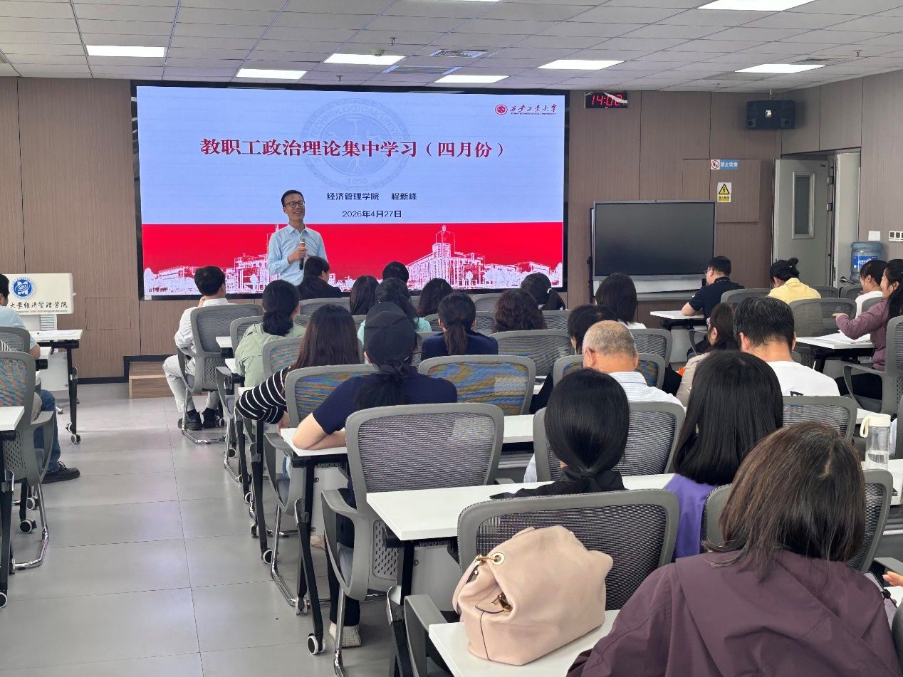 4 月 27 日,经济管理学院组织开展教职工政治理论集中学习会。学院党委书记程新峰主持会议,学院全体教职工参加学习。