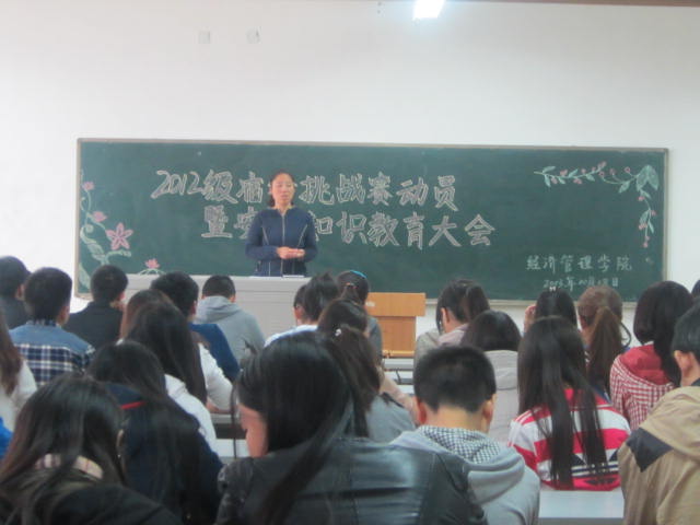10月18日下午,经济管理学院于教5-201、202召开了宿舍挑战赛动员暨安全知识教育大会,2012级班长、团支书以及全体宿舍舍长参加大会,曾灵秀老师、冯琳老师担任主讲。