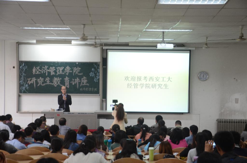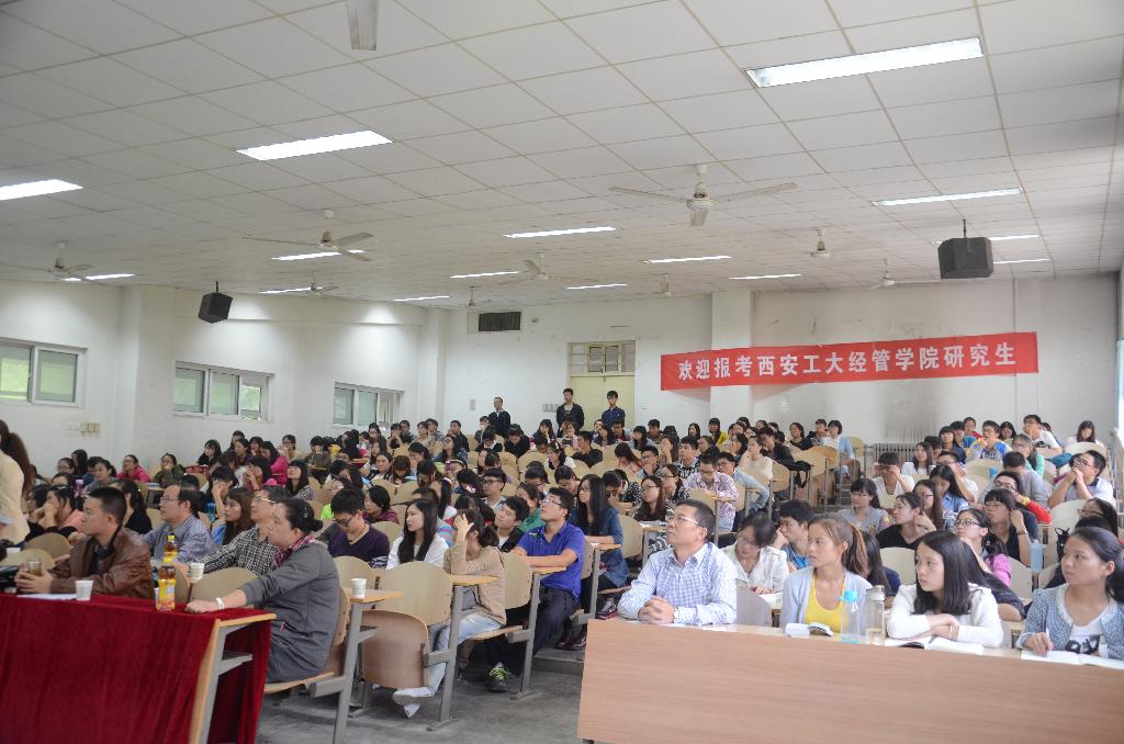 首先,研究生部孙杨老师就西安工业大学的考研优惠政策、报考研究生的相关注意事项进行了宣讲。其次,思政部副主任王苏喜教授、我院研究生导师苏兵教授、董广茂教授、郭庆军副教授、曹丽博士、张根龙副教授、陈健副教授、徐阳博士分别从学科发展,科研团队、研究方向、研究成果、在研项目及社会影响等方面向同学们进行了非常详细的介绍。最后,我院副院长宋元梁教授就经济学方向的研究生报考情况进行了讲解,并积极鼓励和热烈欢迎同学们报考本院的硕士研究生。
