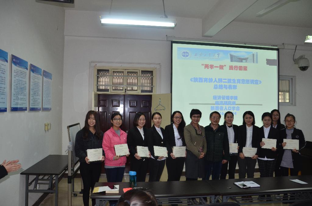 11月4日上午,我院在教5—502举行了暑期调研总结及表彰大会。主要围绕陕西省卫计委专项调查《陕西育龄人群二孩生育意愿调查》项目进行。参会人员有经济管理学院宋元梁教授、王芹副教授、学工部主任以及参与此项调研的学生,我院党委书记曹玉玲出席了大会。