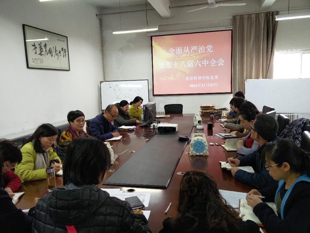 11月23日上午,为进一步深入开展“两学一做”学习教育,认真学习贯彻十八届六中全会精神,经济管理学院党委中心组开展了主题为“全面从严治党,聚焦十八届六中全会”的学习教育,此次主题学习由学院党委书记曹玉玲主持,学院党委委员及教工、学生党支部书记参加了这次学习教育。