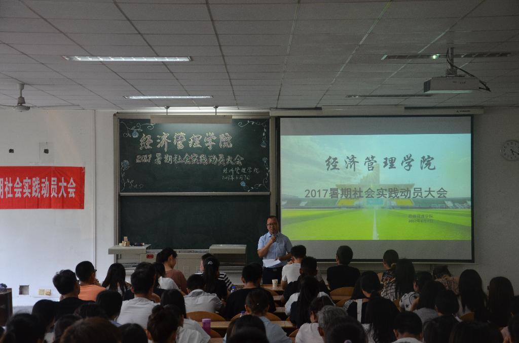 6月7日下午,经济管理学院在教2-206召开了2017年暑期社会实践动员大会。我院团委书记冯川川,主席团、全体团学干部以及大一、大二、大三年级班长团支书参加会议。在会上,团委书记冯川川对同学们作了动员讲话。他指出,社会实践是同学们经风雨、见世面、受教育、长才干的重要途径。历年来,学院领导高度重视,社会实践工作也取得了不错的成绩,他希望学生干部积极宣传社会实践,组织大家踊跃组队申报。随后,他强调,同学们要在做好社会实践的同时,积极做好宣传工作,加强与各媒体之间的联系,加大对实践活动的宣传力度。此外,他还为同学们详细介绍了本次社会实践活动的主题、活动内容和调研方向,详细介绍了社会实践申报表的填写,鼓励同学们积极参加本次暑期社会实践活动。最后,社会实践部为同学们讲解了本次社会实践申报材料提交的相关注意事项。