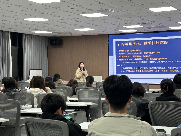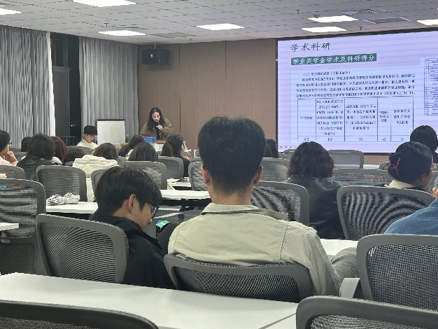 王姝同学介绍了获得国奖以及各种奖学金的评选细则,围绕 “提升个人能力与竞争力” 这一核心,鼓励 2025 级同学在专注课堂学习的基础上,可主动参与科研项目锻炼创新思维,通过学科竞赛检验学习成果。还能考取专业资格证书增强行业认可度,同时投身企业实习或社会实践,推动理论知识向实战经验转化。此外,她还建议大家尽早明确职业规划或学术目标,在研究生期间有方向地持续充实自我,书写属于自己的青春华章。